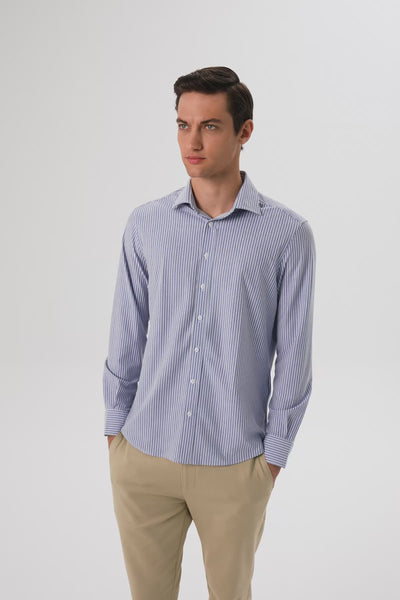 Abbate Floransa Örme Kumaş Pamuk Karışımlı Comfort Fit Lacivert Klasik Yaka Erkek Çizgili Gömlek