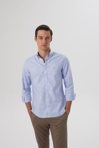 Abbate Lusso Twill Pamuklu Comfort Fit Açık Mavi Düğmeli Yaka Erkek Kareli Gömlek