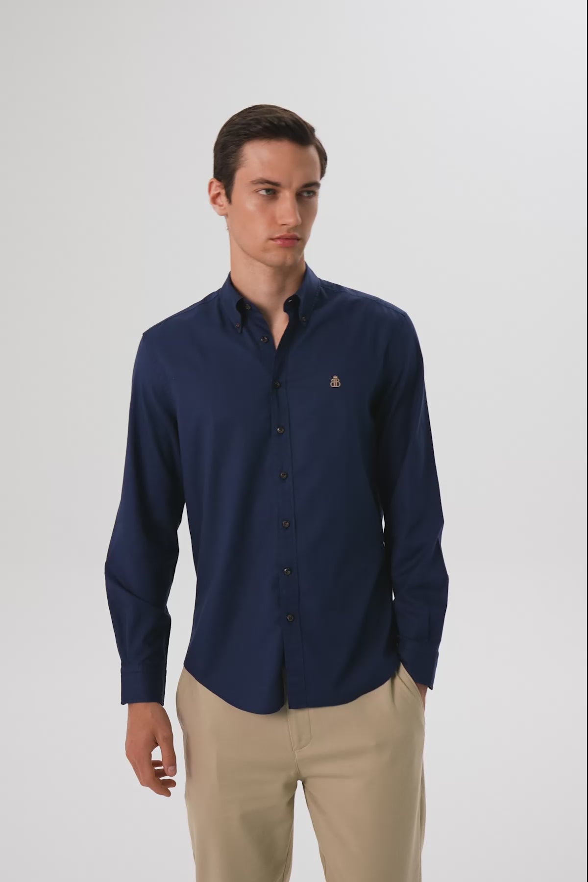 Abbate Mario Poplin Pamuklu Comfort Fit Lacivert Düğmeli Yaka Erkek Düz Gömlek