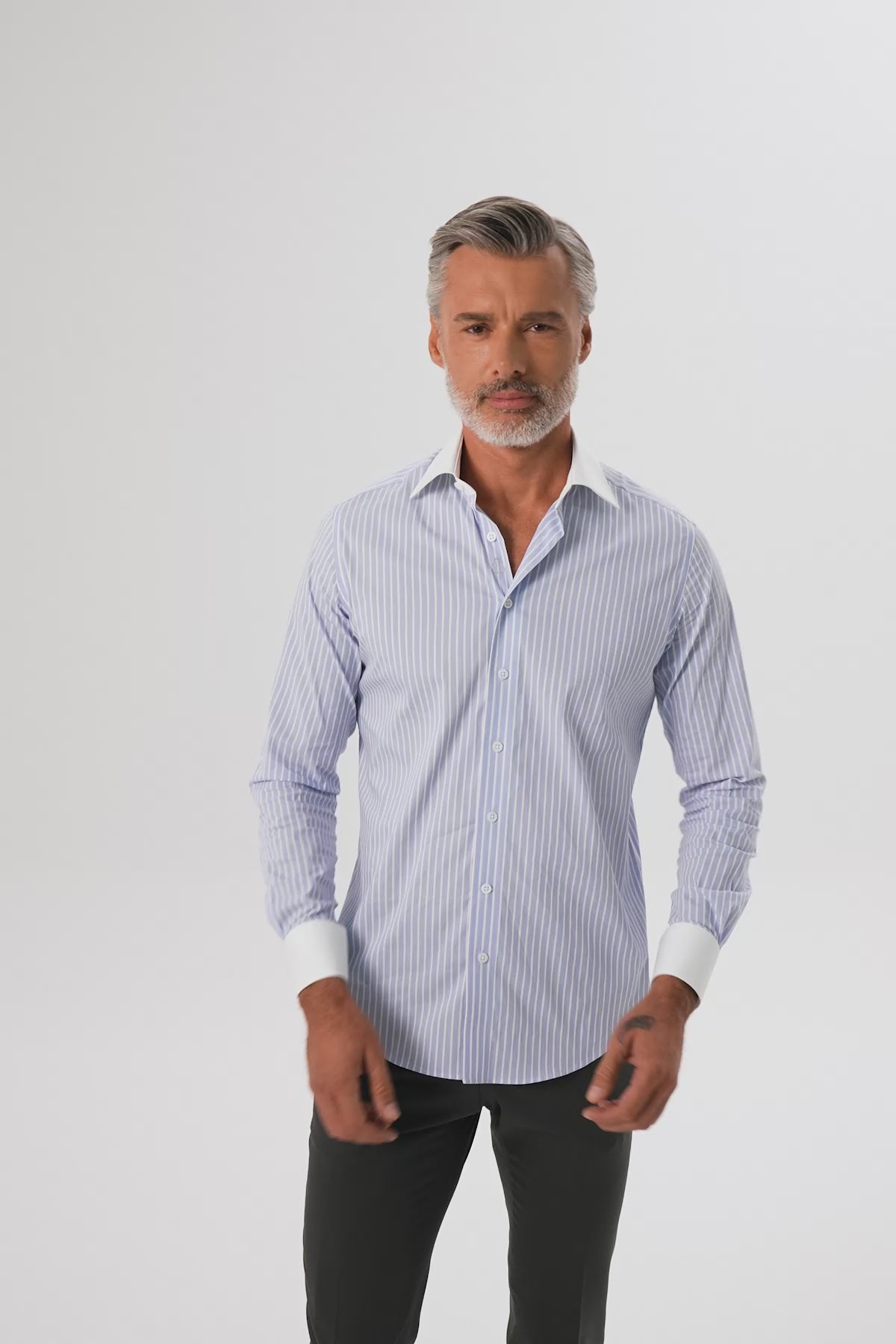 Abbate Sartoria, İtalyan Monti kumaşının likralı pamuk dokusuyla tasarlandı. Sırt ve omuz kısmındaki parçalı robası sayesinde gün boyu konfor ve hareket özgürlüğü sunar. Özel yaka ve manşet detayları, inci parlaklığındaki sedef düğmelerle tamamlandı. Düğmeler, kopmalara karşı geliştirilen özel teknolojiyle güçlendirildi. Her gömlekle birlikte yedek yaka ve yedek manşet sunulmaktadır.