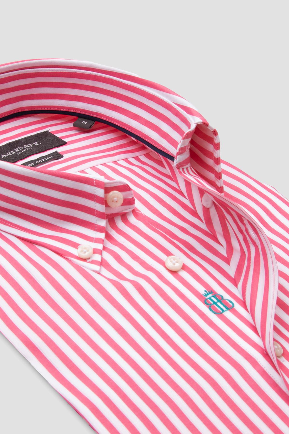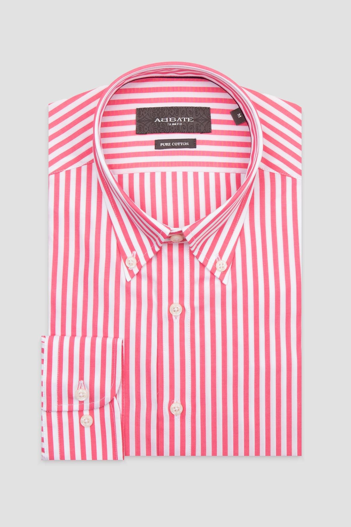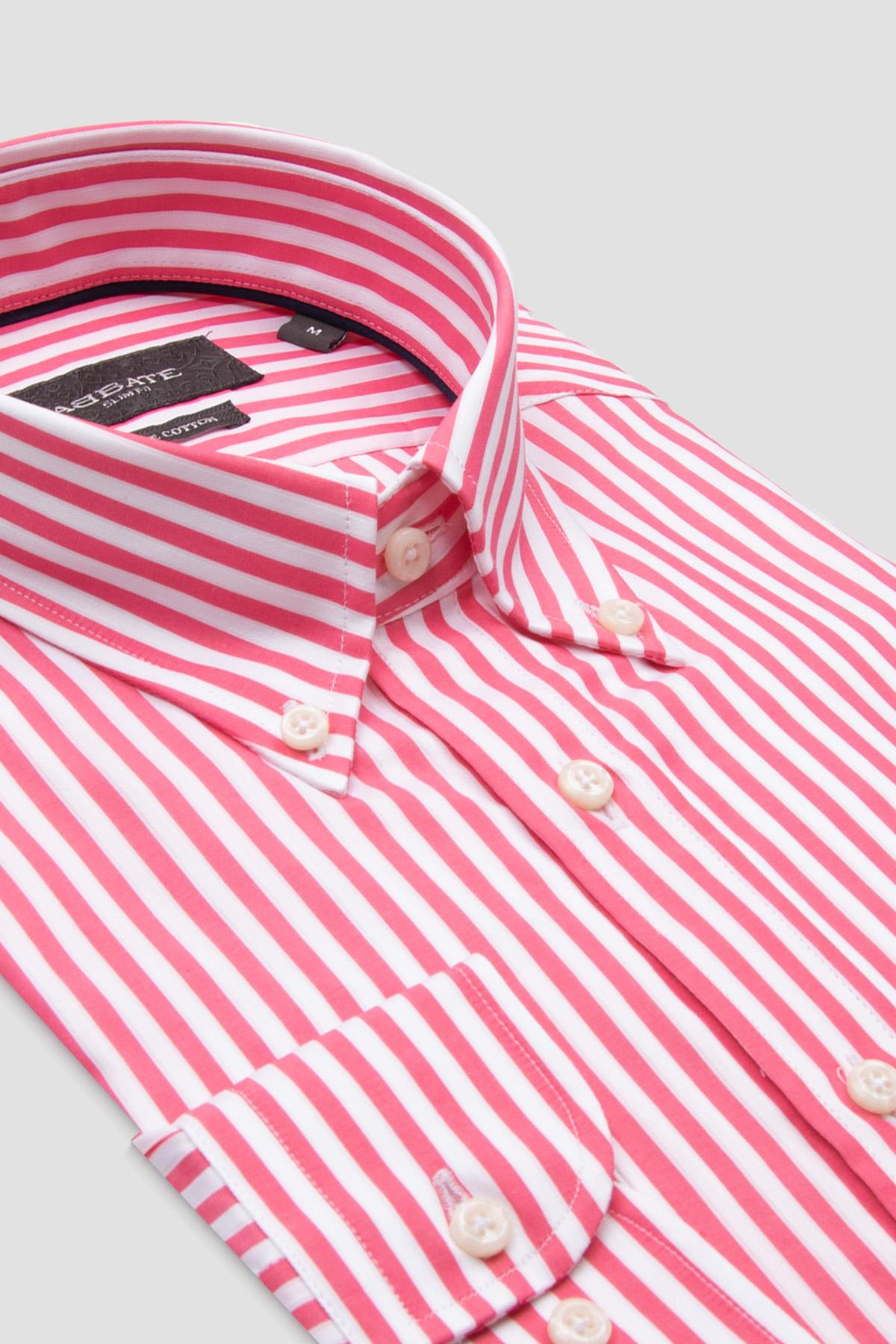 Abbate Carlo Twill Pamuklu Slim Fit Pembe Düğmeli Yaka Erkek Çizgili Gömlek (AMSH10041-007)