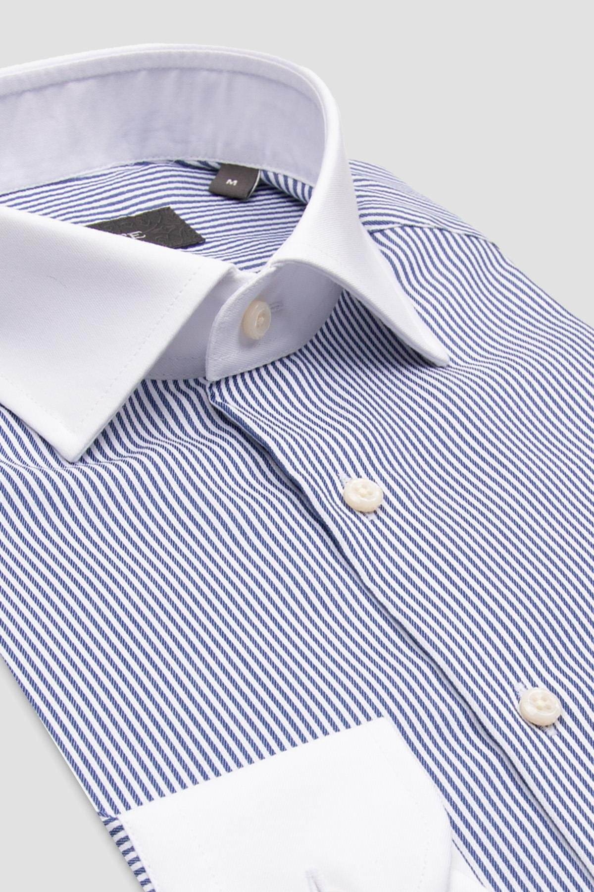 Yaka ve manşetlerdeki beyaz kontrast detaylar, gömleğe çağdaş ve sofistike bir dokunuş ekler